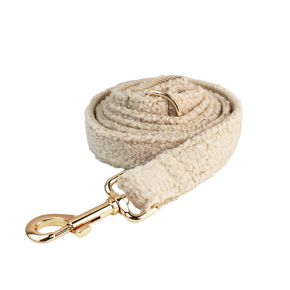 A stylish and elegant pet accessory set, which includes a harness, collar, and lead, all made from a soft, cream-colored teddy fleece material. The fabric has a cozy, textured appearance, similar to the material used in plush toys, giving it a warm and inviting feel. The set is adorned with high-quality gold hardware, including buckles and clips, that add a luxurious touch. The collar also features a matching bow tie in the same cream teddy fleece, enhancing the overall aesthetic of the set. This design is perfect for pet owners who want their dogs to look sophisticated while staying comfortable.