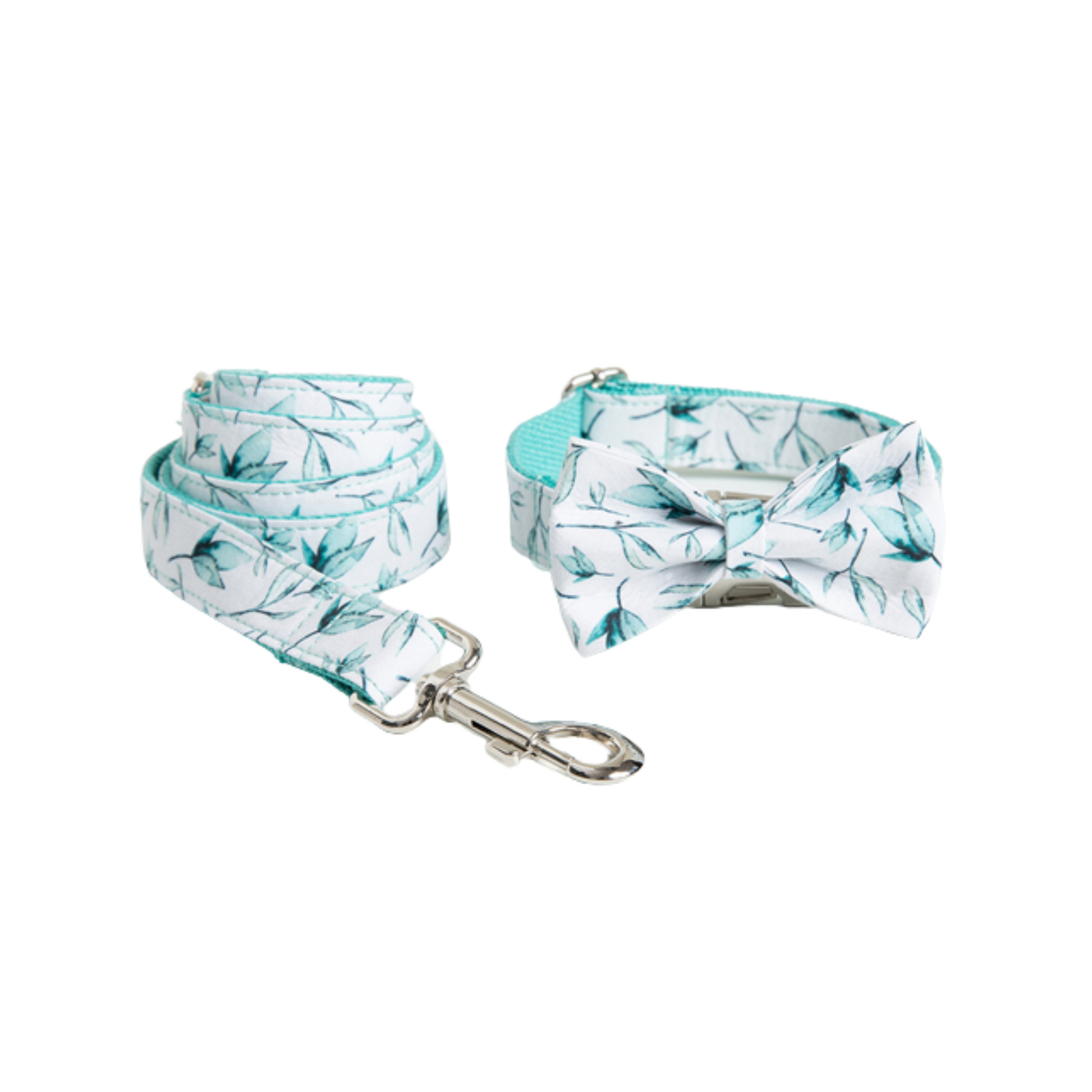 Personalized Adjustable Leaf Printed Dog Collar Leash Set with Bow Tie