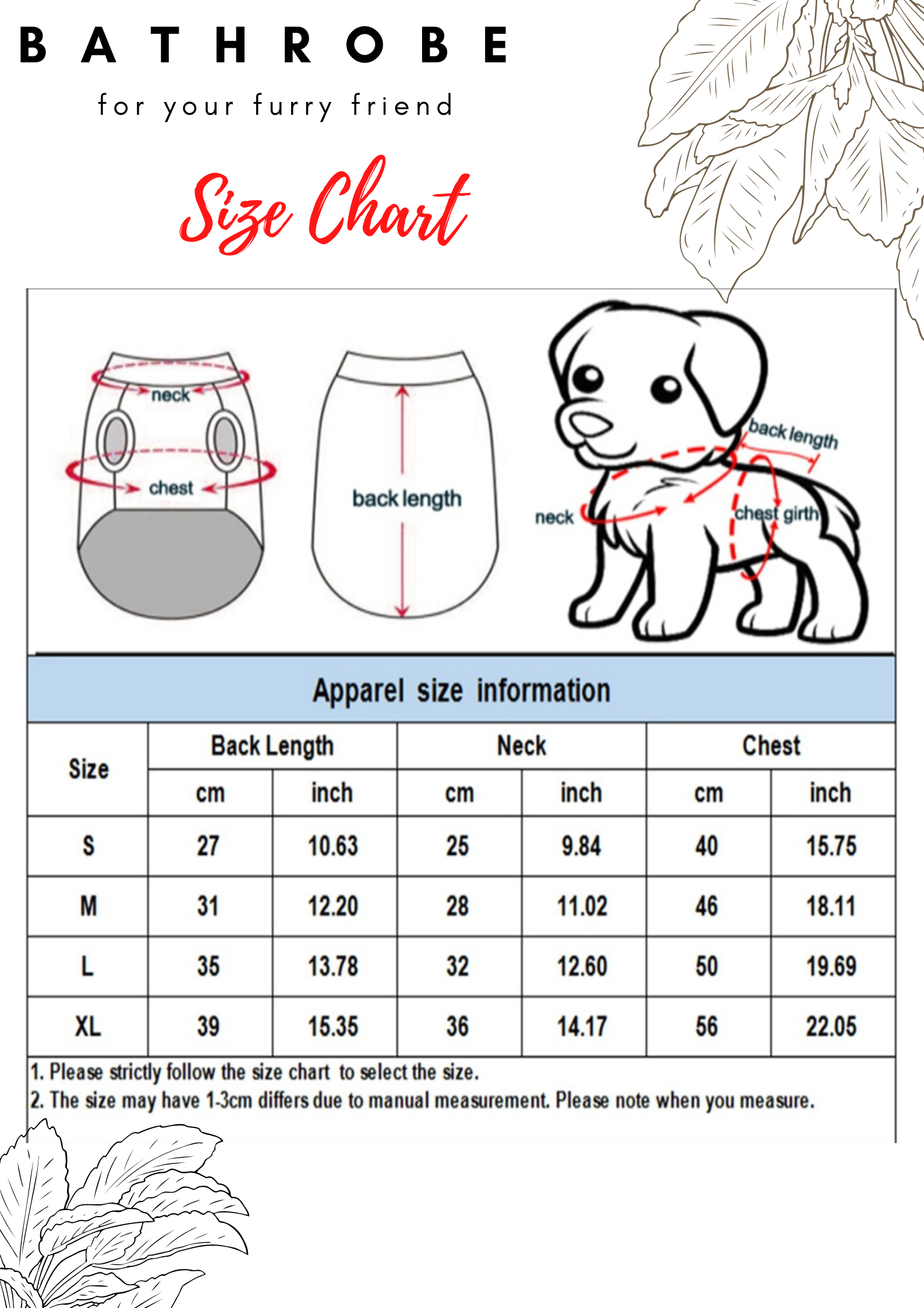 1. Choose the larger size if your dog is between two sizes. Please allow 2-3cm differences due to manual measurement.