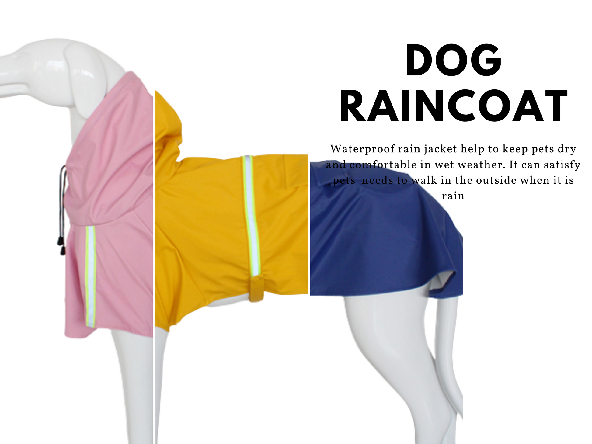 Our dog rain coats are made of the highest quality materials to keep your pets dry and comfortable in wet weather. Made with reflective stripes on the back, this jacket ensures that you will be able to see them at night or in the dark. You can be sure they won't get sick when you take them out in foul weather